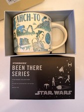 Starbucks Been There – Ahch-To is a mug for a planet from the Unknown Regions that was mostly covered with water and numerous rocky islands poking here and there. It was believed to be the birthplace of the Jedi Order. Luke Skywalker made this planet his home many years after the Galactic Civil War, you can see him on the front of the mug. It was Ahch-To where he agreed to train Rey (Skywalker) (the right side of the front of the mug). She came to this planet looking for answers about the power inside her and expected the old Jedi Master to help the remaining members of the Resistance. Once she stumbled upon an old tree containing some of the last recorded Jedi texts (you can see them just below the title of the mug), Luke agreed to give her exactly three lessons of the Jedi Order.