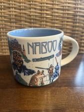 Starbucks Been There – Naboo is the third mug from the 2022 batch of the Star Wars themed releases. In the Star Wars universe, Naboo was a beautiful planet from the Mid Rim Territories. Originally, it was populated by the amphibian Gungans. One of their representative, Jar Jar Binks, is depicted on the lower front part of the mug. Later in time a group of human colonists from Grizmallt landed on the planet and named it and themselves Naboo. Unfortunately, their arrival led to a series of conflicts with Gungans over territory and resources. In the end, the two species were able to resolve disagreements and learned to live apart and ignore each other. It was not all peaceful since. Both Naboo (humans) and Gungans later went through a series of civil wars among themselves. After years of conflicts, Boss Gallo and King Jafan united Gungans and Naboo respectively and founded two new capitals: Otoh Gunga (a bubble-like building from it can be seen on the back of the mug), and Theed (to the left of “Naboo” title of the mug).