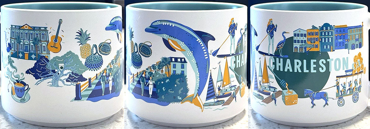 The Discovery Series – Charleston mug brings together the city’s well-known symbols that we saw in the design of the ornament, including Rainbow Row, a horse-drawn carriage, bottlenose dolphins, kayaking and paddleboarding, the Angel Oak, and Deviled Crab. On the side and back, the design goes further, adding new symbols that highlight even more of what makes Charleston unique.