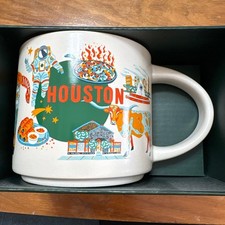 This mug design showcases a mix of landmarks and cultural symbols that capture the spirit of Houston.