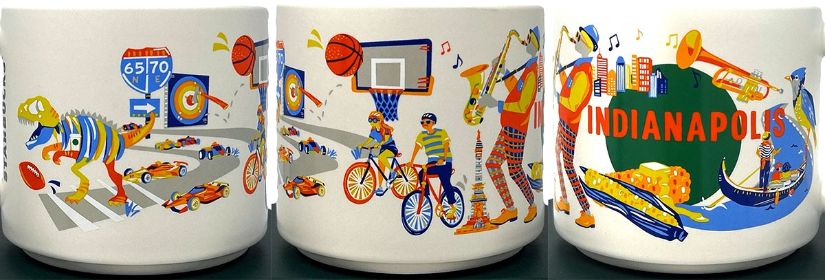 This mug design brings together a variety of symbols and scenes that reflect the character and history of Indianapolis.