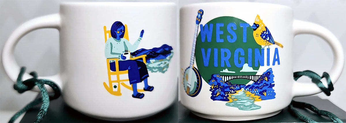 Please note that the West Virginia mug from this series features many more state symbols and landmarks. I especially liked the inclusion of the signature dishes of West Virginia in the design. As for the ornament, these are the elements picked by the designers: