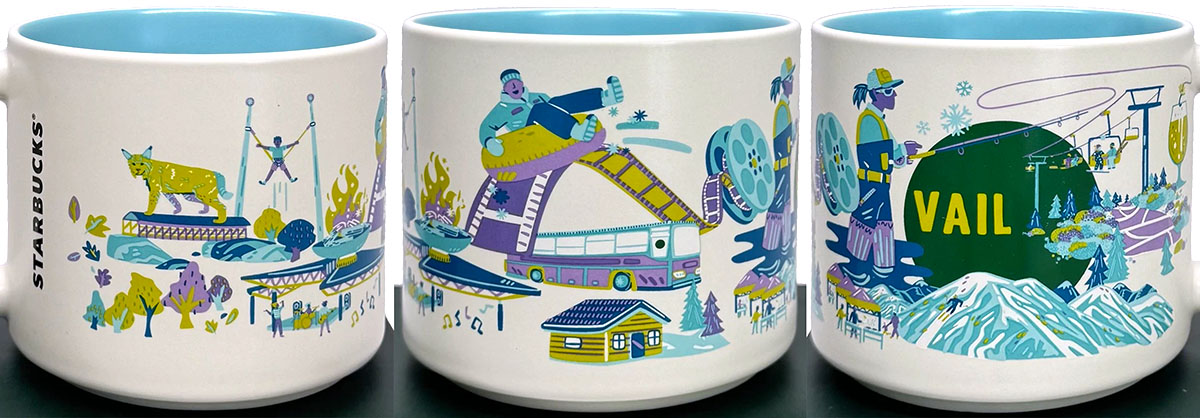 The mug design brings together several visual elements that reflect the character and atmosphere of Vail.