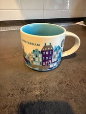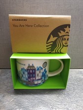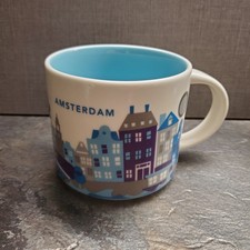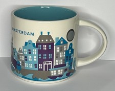 Starbucks You Are Here Amsterdam was the first European mug from this series and for quite some time, it remained the only YAH from outside of North America. It is important to note, that the original release of 2013 was limited and the mug was considered HTF (hard to find). Three years later, Starbucks released it again with the same design but slightly different shades of blue and grey colors, which was probably due to the different manufacturer of the mug. One can easily tell these two versions apart by looking at the bottom of the mug: anything with the production year 2016 and above is the new version. Some collectors consider these v1 and v2 and it probably makes sense, since they have different SKUs (product codes). Below, you can see a collage of what the bottom of You Are Here Amsterdam looked like through the years. Note the different barcode labels and the amount of text printed.