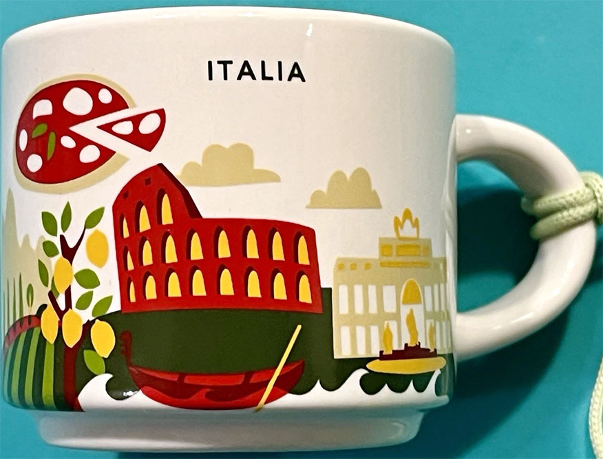 Along with an updated mug for the capital city, Starbucks has also released a new version of the country ornament! A brand-new design was spotted in stores, and it appears to be replacing the previous one. You Are Here Ornament – Italia uses the name Italians actually use for their country. Interestingly, I haven’t seen the larger mug yet, but I’m sure it’s coming soon.